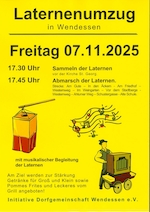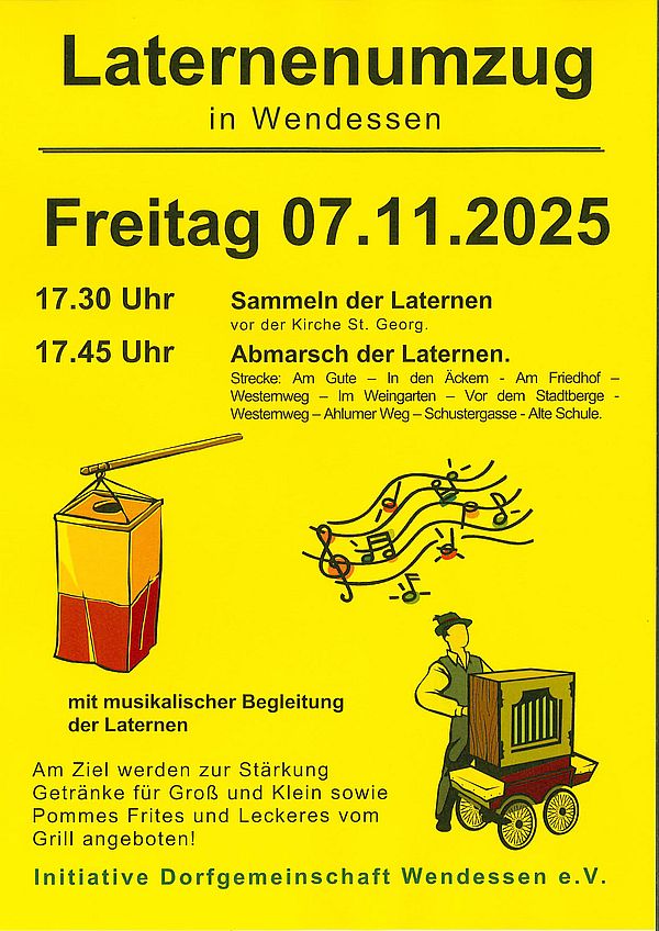 Am Freitag 07.11.2025 um 17.30 Uhr sammeln sich die Laternen vor der Kirche St. Georg in Wendessen, um dann um ca. 17.45 Uhr zum Laternenumzug durch Wendessen zu starten.