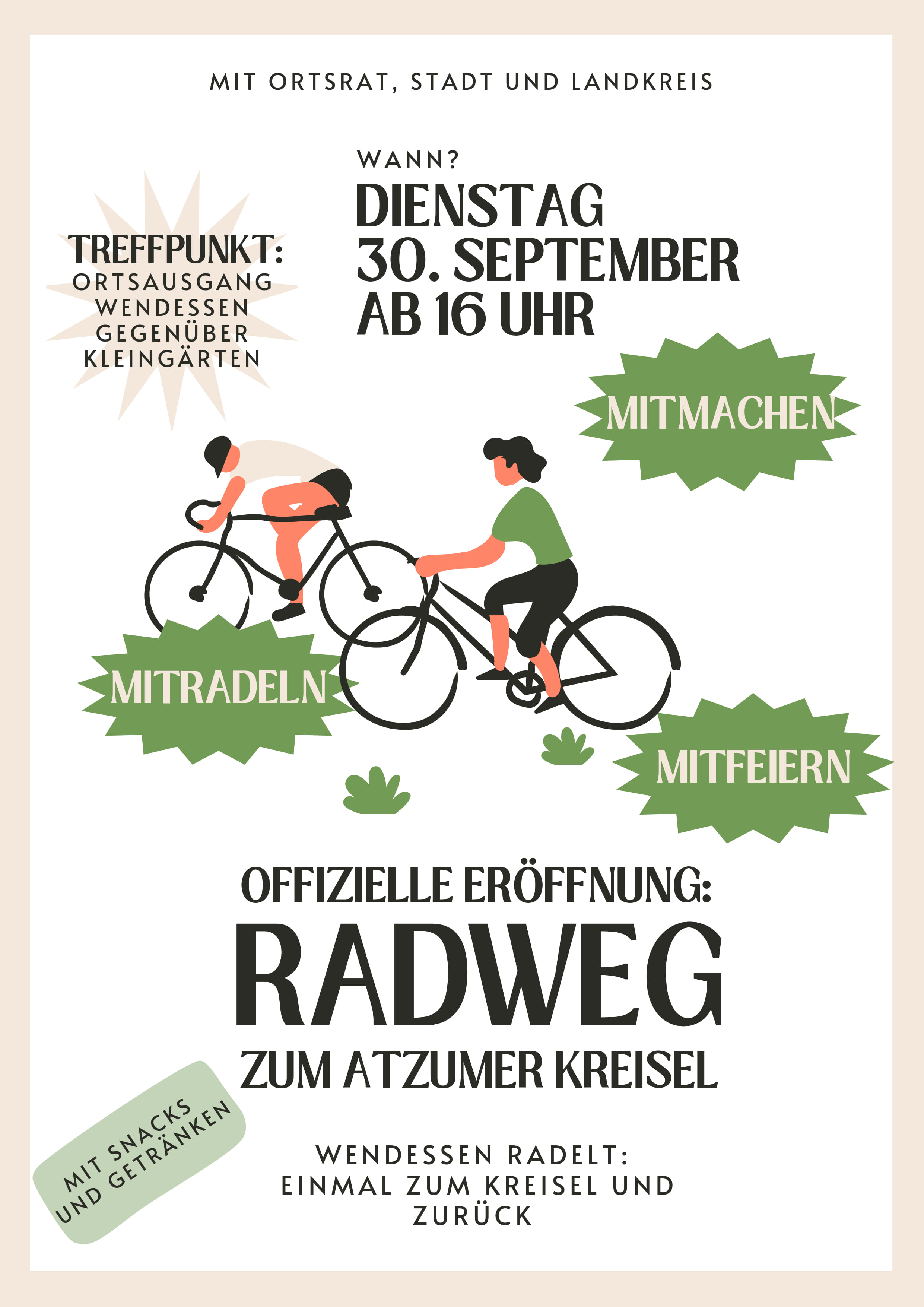 Unser 1,3 Kilometer langer Radweg zum Atzumer Kreisel ist fast fertig und soll bereits am kommenden Dienstag (30. September) um 16 Uhr offiziell freigegeben werden. Das möchte der Landkreis Wolfenbüttel als Bauherr feiern, und wir Wendesser natürlich auch!